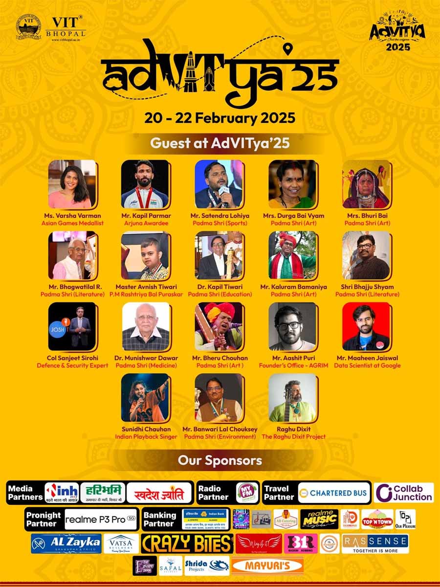वीआईटी भोपाल विश्वविद्यालय में 20 फरवरी 2025 से 'अद्वित्या 2025' वार्षिक सांस्कृतिक महोत्सव का शुभारंभ हुआ है, जो 22 फरवरी 2025 तक चलेगा। इस तीन दिवसीय महोत्सव में 131 विविध आयोजन शामिल हैं, जिनमें 53 तकनीकी और 59 गैर-तकनीकी प्रतियोगिताएँ, वर्चुअल इवेंट्स, बाइक स्टंट शो, डीजे नाइट, रंग-ए-रास डांस नाइट, मध्य प्रदेश गौरव अवार्ड्स, ड्रोन शो, नृत्य, नाटक, क्विज़, टैलेंट हंट और कोडिंग चैलेंजेस शामिल हैं। इस महोत्सव में पूरे राज्य से लगभग 20,000 छात्रों की भागीदारी की उम्मीद है।