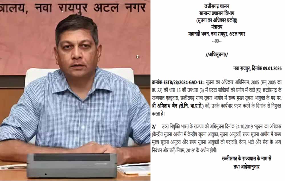 अमिताभ जैन (से.नि. भा.प्र.से.) को छत्तीसगढ़ राज्य सूचना आयोग में राज्य मुख्य सूचना आयुक्त के पद पर नियुक्त किया गया है। उनका कार्यभार ग्रहण करने की तिथि से ही यह नियुक्ति प्रभावी होगी। राज्य के उच्चतम सूचना अधिकारी के रूप में अमिताभ जैन की जिम्मेदारी होगी कि वे सूचना का अधिकार अधिनियम के तहत सभी मामलों और अपीलों का निष्पक्ष और समयबद्ध निपटान सुनिश्चित करें।