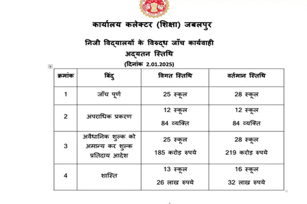 जिला कलेक्टर दीपक सक्सेना ने बताया कि प्रशासन ने अब तक 28 स्कूलों के खिलाफ कार्रवाई कर 219 करोड़ रुपये लौटाने के आदेश दिए हैं। इसके अलावा, प्रत्येक स्कूल पर 2 लाख रुपये जुर्माना भी लगाया गया है। एक दर्जन स्कूल प्रबंधन से जुड़े 84 लोगों पर एफआईआर दर्ज की गई है। यह कार्रवाई मध्य प्रदेश निजी विद्यालय अधिनियम के तहत की गई है। प्रशासन द्वारा अन्य स्कूलों की भी जांच जारी है, जिससे जल्द ही और दोषी स्कूलों के खिलाफ कार्रवाई की उम्मीद है।