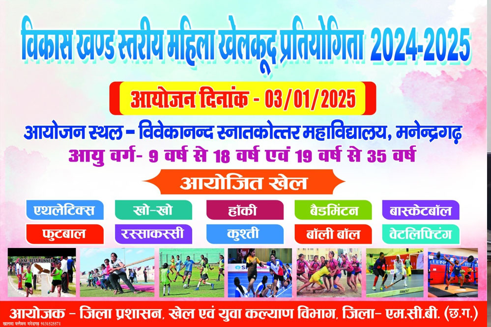 कलेक्टर डी. राहुल वेंकट और खेल अधिकारी गोपाल सिंह के निर्देशानुसार मनेंद्रगढ़ के शासकीय विवेकानंद स्नातकोत्तर महाविद्यालय के खेल प्रांगण में विकासखंड और जिला स्तर पर बालिका/महिला खेलकूद प्रतियोगिता का आयोजन किया जाएगा। विकासखंड स्तर की प्रतियोगिता 03 जनवरी 2025 को तथा जिला स्तर की प्रतियोगिता 04 जनवरी 2025 को आयोजित होगी। प्रतियोगिता में खो-खो, फुटबॉल, बास्केटबॉल, वॉलीबॉल, वेटलिफ्टिंग, रस्सा-कस्सी, हॉकी, कुश्ती, बैडमिंटन और एथलेटिक्स जैसे खेलों की स्पर्धाऐं आयोजित की जाएंगी।