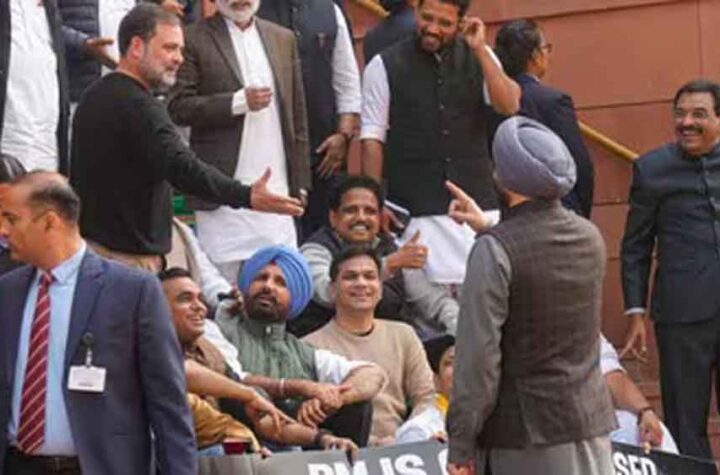 नई दिल्ली संसद भवन परिसर में प्रदर्शन के दौरान लोकसभा में नेता प्रतिपक्ष राहुल गांधी और केंद्रीय मंत्री रवनीत सिंह...