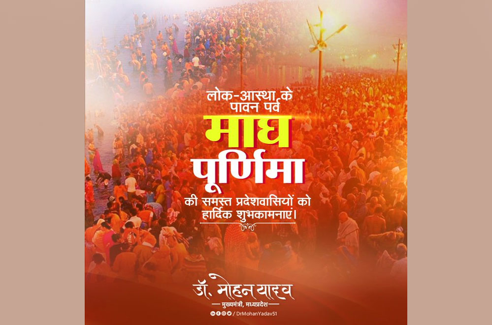मुख्यमंत्री डॉ. मोहन यादव ने लोक आस्था के पर्व माघ पूर्णिमा की सभी श्रद्धालुओं को बधाई और शुभकामनाएं दी हैं।