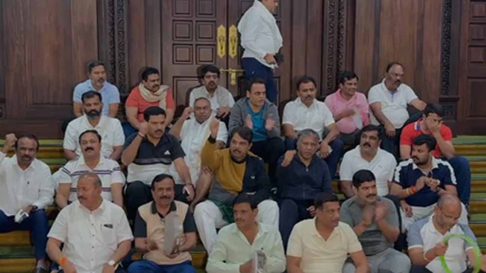 शराब घोटाला: भाजपा-जेडीएस विधायकों ने विधानसभा में बिताई रात, भजन-गीत और नारे लगाकर किया प्रदर्शन