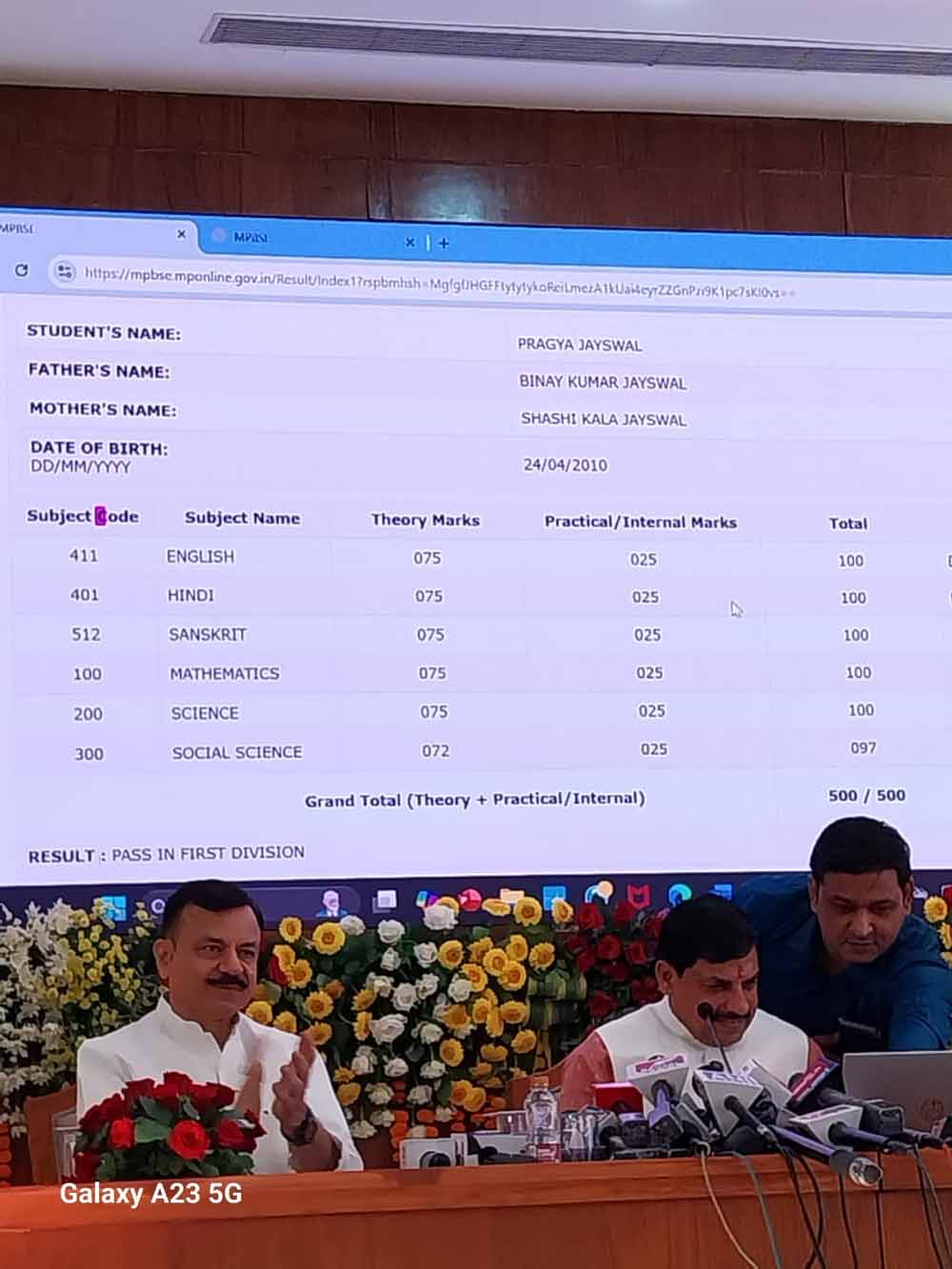 परिणाम जारी करते हुए मुख्यमंत्री डॉ. मोहन यादव ने दसवीं की टॉपर प्रज्ञा जायसवाल की मार्कशीट भी दिखाई, जिनको 500 में से 500 अंक हासिल हुए।