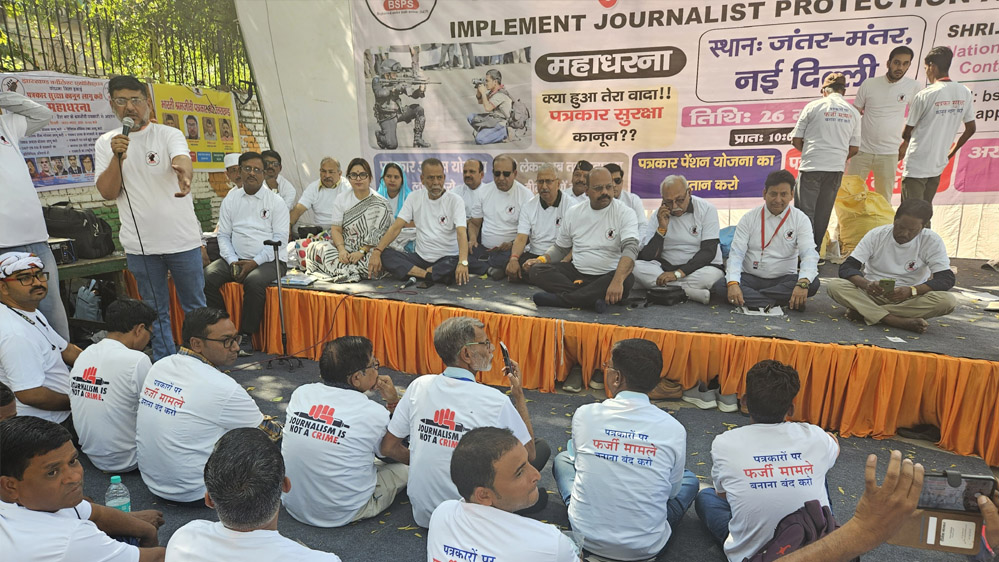 भारती श्रमजीवी पत्रकार संघ (बीएसपीएस) के राष्ट्रीय अध्यक्ष अशोक पांडेय ने प्रधानमंत्री नरेंद्र मोदी ने सत्ता में आने से पहले पत्रकारों सुरक्षा कानून लाने का जो वादा किया था, उसे पूरा करे और पत्रकार प्रोटेक्शन एक्ट जल्द से जल्द लागू करे।आज नई दिल्ली के जंतर-मंतर पर एक दिवसीय महाधरना को श्री पाण्डेय ने संबोधित किया। इस धरने में देशभर के पत्रकारों ने अपनी उपस्थिति दर्ज कराई और विभिन्न महत्वपूर्ण दस सूत्रीय मांगों को लेकर भारत सरकार का ध्यान आकर्षित किया।