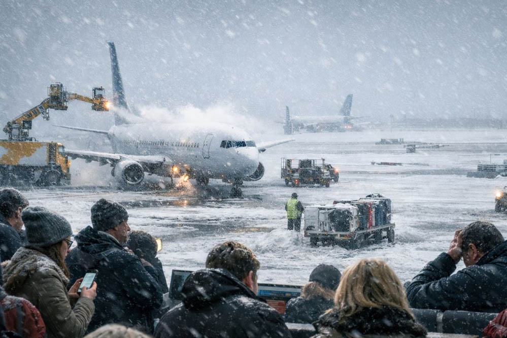 खतरनाक मौसम ग्रेट लेक्स से लेकर नॉर्थईस्ट तक फैल गया, जिससे बड़े एयरपोर्ट्स पर कामकाज बाधित हुआ है.