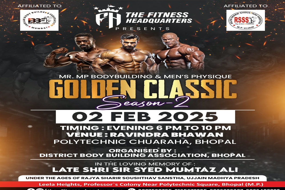 भोपाल जिला बॉडीबिल्डिंग संगठन द्वारा गोल्डन क्लासिक राज्य स्तरीय बॉडीबिल्डिंग एवं मेन फिजिक चैंपियनशिप का आयोजन रविवार 2 फरवरी 2025 को किया जा रहा हे l प्रतियोगिता की जानकारी देते हुए भोपाल बॉडीबिल्डिंग के प्रेसिडेंट राजेंद्र रावरिकर एवं कोषाध्यक्ष आशीष टॉक ने बताया की इस प्रतियोगिता में मध्य प्रदेश के विभिन्न जिलों से लगभग ढाई सौ खिलाड़ी प्रतिभागी होंगे प्रतियोगिता हेतु वजन प्रातः 9:30 से 12:30 बजे तक लिया जाएगा कार्यक्रम स्थल रविंद्र भवन पॉलिटेक्निक चौराहे के पास इस प्रतियोगिता में लगभग ढाई लाख रुपए नगद एवं आकर्षक ट्राफियां प्रदान की जाएगीl