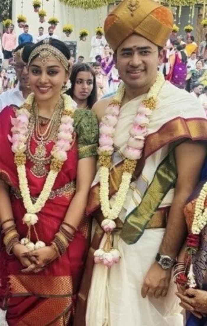 भाजपा सांसद तेजस्वी सूर्या ने शादी कर ली है। उनका विवाह शास्त्रीय संगीत की कलाकार शिवश्री स्कंदप्रसाद से हुआ है। उन्होंने हिंदू रीति-रिवाजों और कन्नड़ परंपरा के अनुसार विवाह किया। इस मौके पर केंद्रीय मंत्री वी. सोमन्ना, अमित मालवीय, प्रताप सिम्हा, बीवाई विजयेंद्र समेत कई नेता पहुंचे थे। कई नेताओं ने शादी समारोह की तस्वीरें सोशल मीडिया पर साझा की हैं। तस्वीरों में शिवश्री स्कंदप्रसाद पीले रंग की कांचीपुरम सिल्क साड़ी और गोल्ड जूलरी में नजर आती हैं। इसके अलावा तेजस्वी सूर्या ने सफेद और गोल्डन कलर की ड्रेस पहनी हुई है। सफेद धोती और गोल्डन कलर की स्थानीय पगड़ी में वह बेहद सुंदर लग रहे हैं।