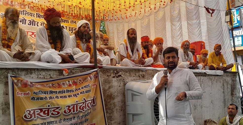 हाइवे को सिक्सलेन बनाने, गो अभ्यारण की मांग को लेकर शहर के खंडा रोड पर संतों का अखंड आंदोलन छठवें दिन भी जारी रहा। इस मांग को लेकर आठ संतों की भूख हड़ताल दूसरे दिन भी जारी रही। वहीं अन्न त्यागकर धरने पर बैठे संत प्रेमदास महाराज गोहद की अचानक से तबीयत बिगड़ गई। उन्हें उपचार के लिए जिला अस्पताल में भर्ती कराया गया। चिकित्सकों का कहना था कि संत का बीपी बढ़ा हुआ है। अखंड आंदोलन के छठवें दिन कांग्रेस के उपनेता प्रतिपक्ष एवं अटेर विधायक हेमंत कटारे मंगलवार को कांग्रेसी कार्यकर्ताओं के साथ आंदोलन स्थल पर पहुंचे। उन्होंने संतों के समक्ष हाथ जोड़कर प्रार्थना करते हुए भूख हड़ताल खत्म करने का आग्रह किया।