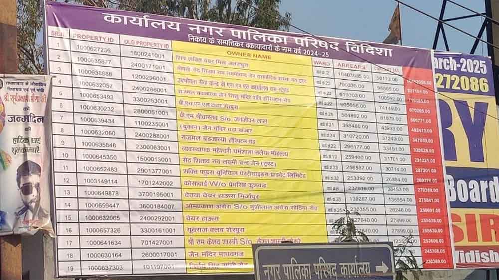 नगरपालिका ने अपने बकायादारों की सूची अब सार्वजनिक करना शुरू कर दिया है। सबसे पहले शहर के टॉप 20 बकायादारों की सूची नगरपालिका परिसर के अलावा माधवगंज चौराहा, पुरानी नगरपालिका परिसर और गांधी चौक पर लगाई गई है।