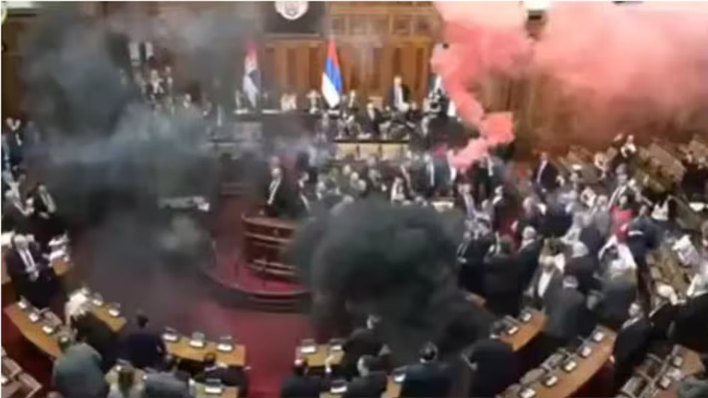 संसदीय सत्र के लाइव टेलीविजन प्रसारण में दिखाया गया कि सर्बियाई विपक्षी सांसदों ने मंगलवार को सरकार की नीतियों के विरोध में संसद के अंदर स्मोक ग्रेनेड और आंसू गैस के गोले फेंके. इसके बाद पूरे संसद में काला और गुलाबी धुआं फैल गया. विपक्षी सांसद सरकार से नाराज प्रदर्शन कर रहे छात्रों का भी समर्थन कर रहे थे.