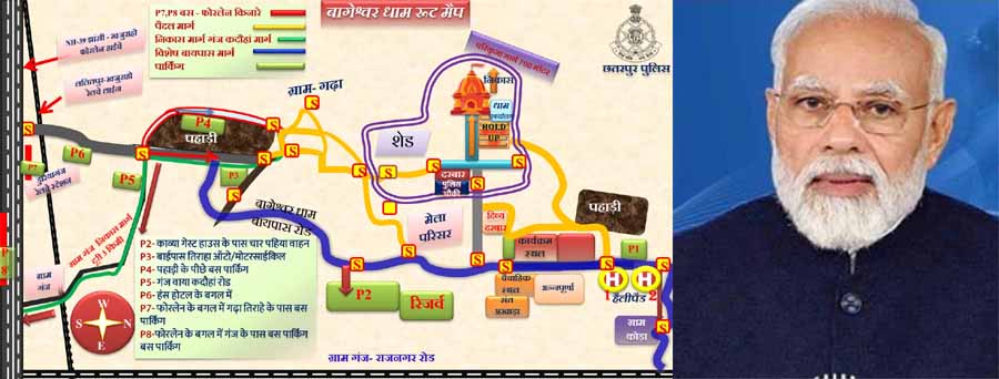 आज प्रधानमंत्री नरेंद्र मोदी पहली बार बागेश्वर धाम पहुंच रहे हैं। पीएम यहां कैंसर हॉस्पिटल की नींव रखेंगे, साथ ही बुंदेलखंड महोत्सव की शुरुआत करेंगे। इसके लिए सुरक्षा व्यवस्था के तगड़े इंतजाम किए गए है। वहीं छतरपुर पुलिस ने पार्किंग व्यवस्था और रूट डायवर्जन का चार्ट भी जारी कर दिया है।